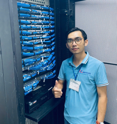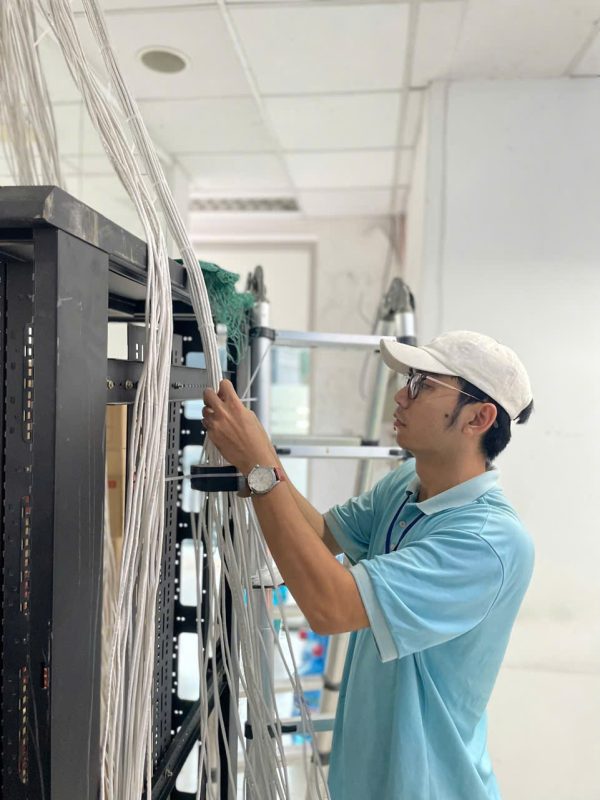 Kỹ thuật viên đấu nối máy chủ với mạng nội bộ